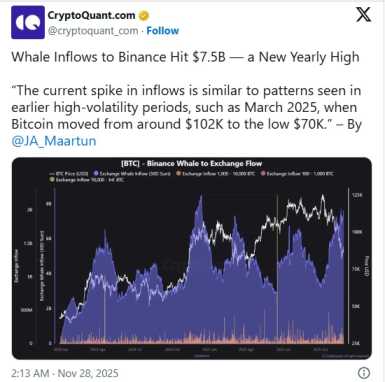 New data from CryptoQuant reveals that Bitcoin is seeing a sharp rise in large-scale inflows to Binance, totaling $7.5 billion over the past 30 days—the highest level recorded this year. Analysts warn that this trend closely mirrors conditions seen in March 2025, just before Bitcoin fell sharply from $102,000 to the low $70,000 range.